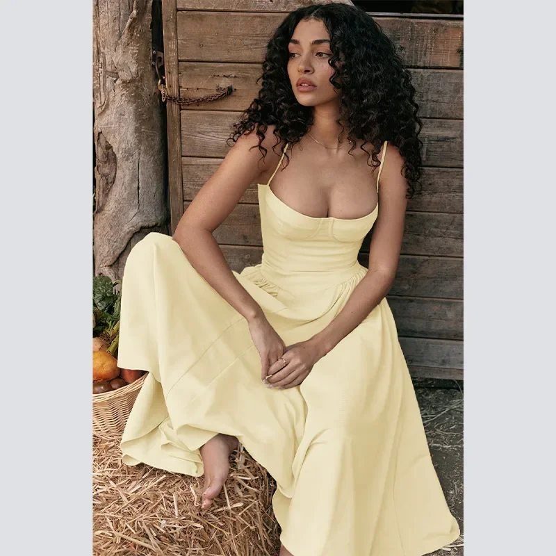 Succombez à l'élégance de cette robe corset sans bretelles. Parfaite pour les mariages et soirées, sa coupe mi-longue et son tissu plissé subliment toutes les silhouettes.