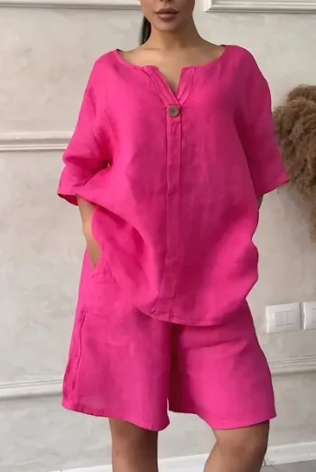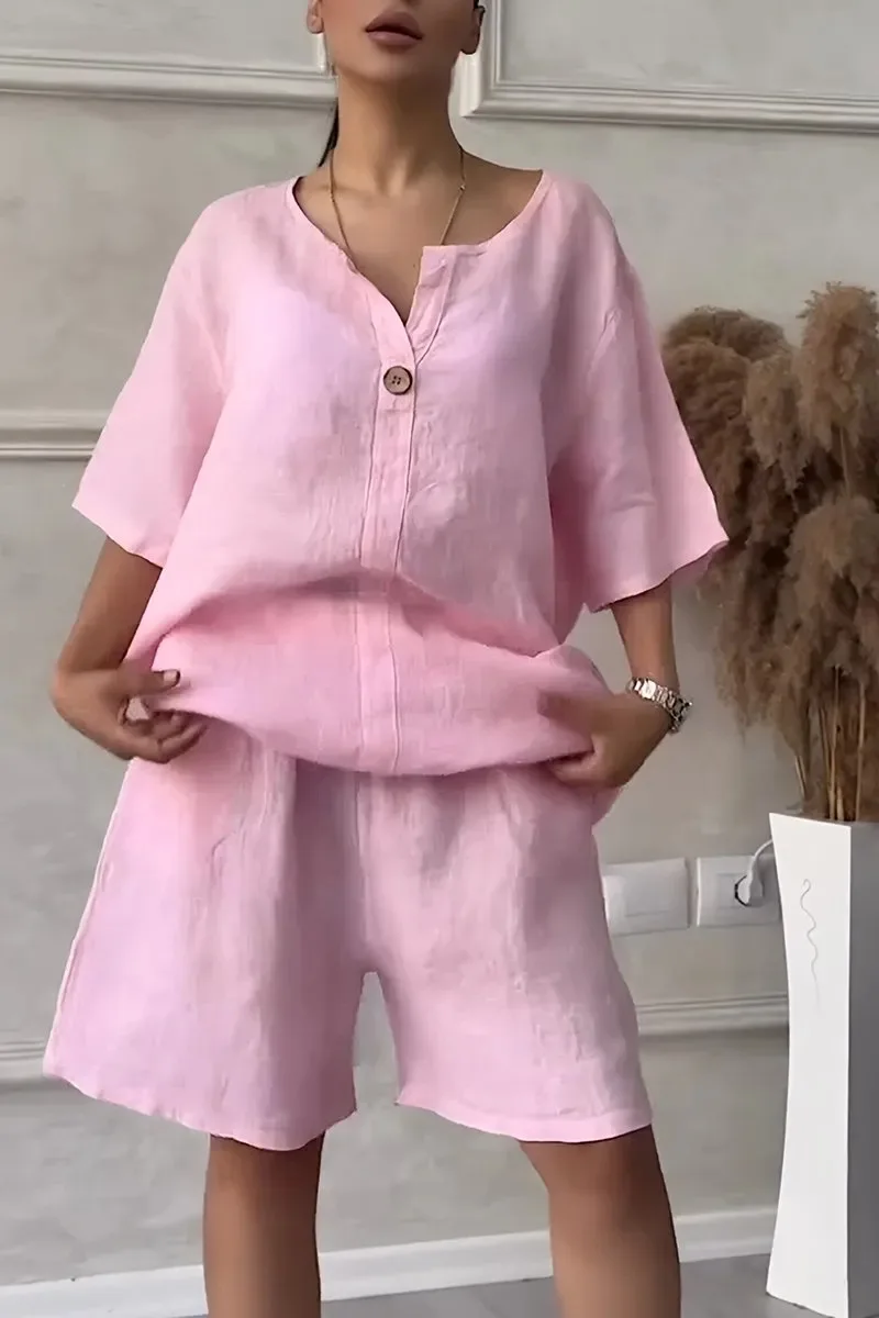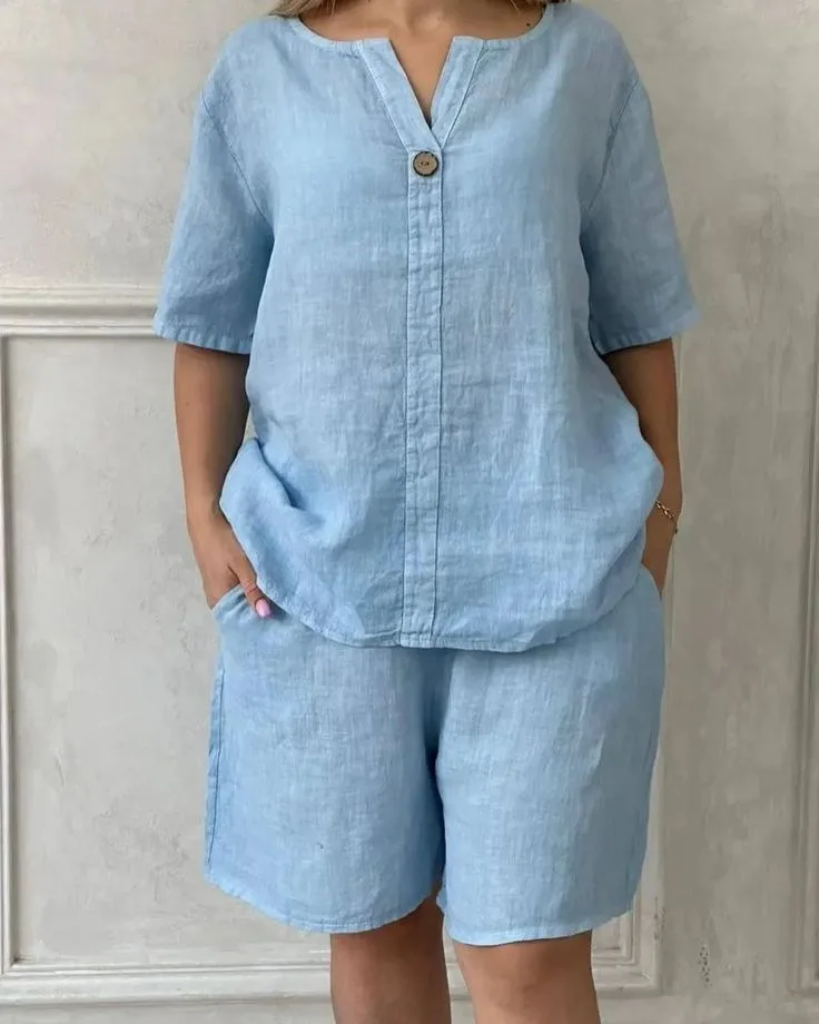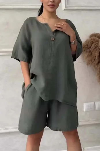 Nouvelle mode : Costume ample femme coton & lin – Haut col V manches courtes