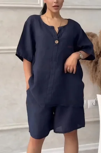 Adoptez un style décontracté chic avec ce costume ample en coton & lin pour femme. Haut col en V, manches courtes, confort et élégance au quotidien.
