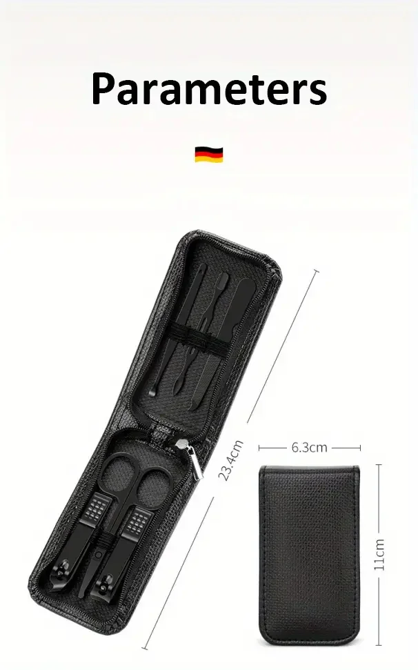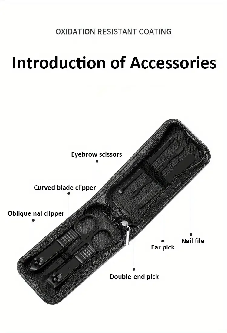 🔹 6 outils essentiels : ciseaux à ongles, coupe-ongles, lime, pince à épiler et accessoires de précision.